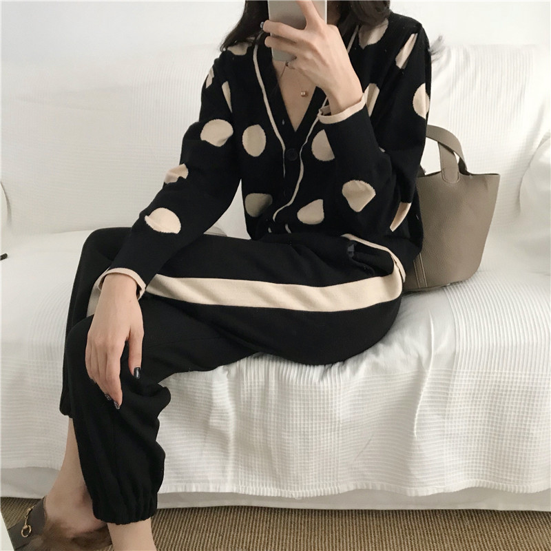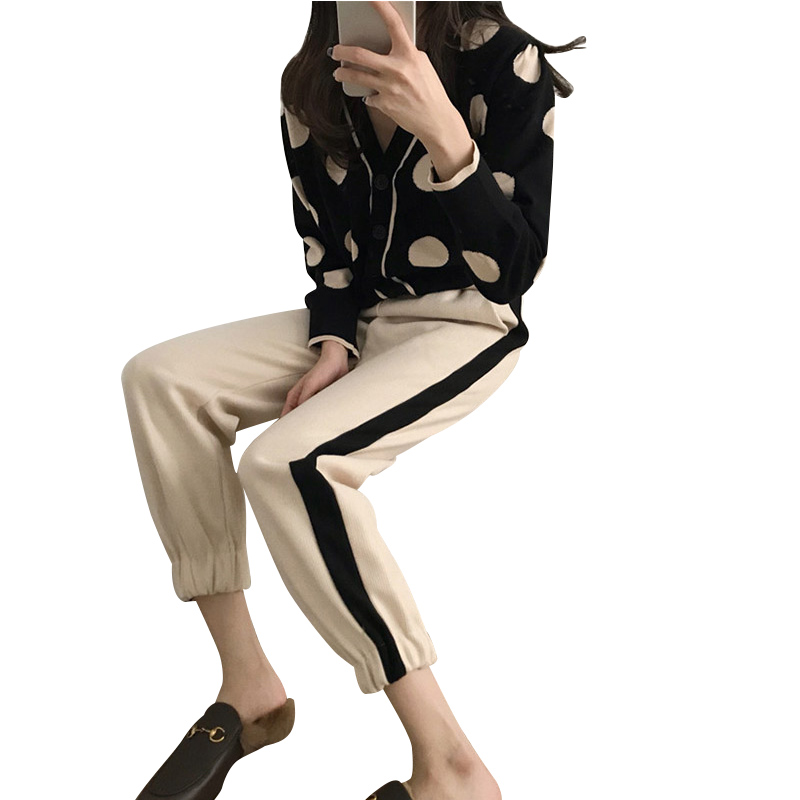 2018新款大波點v領針織衫兩件套寬松側條紋毛呢褲時尚套裝女