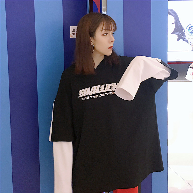 / 秋季韓版中長款原宿風寬松字母拼接長袖慵懶風連帽超火衛衣外套女