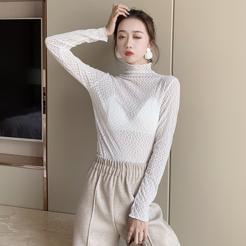 洋氣質蕾絲很仙的上衣秋冬季女裝新款時尚透視黑色修身顯瘦打底衫