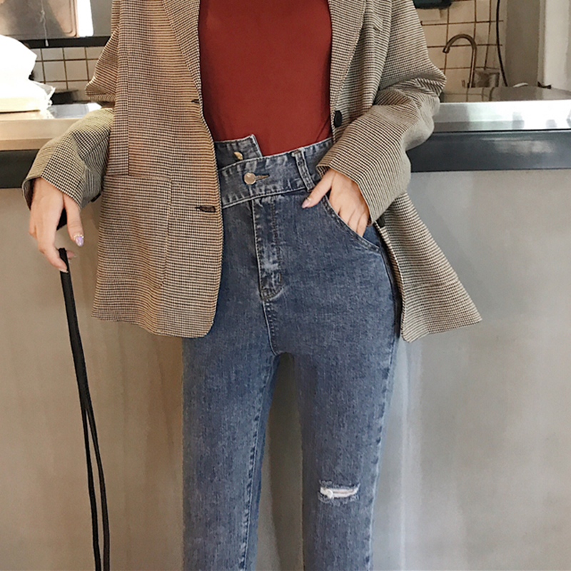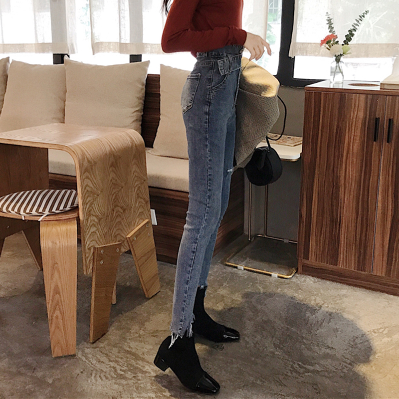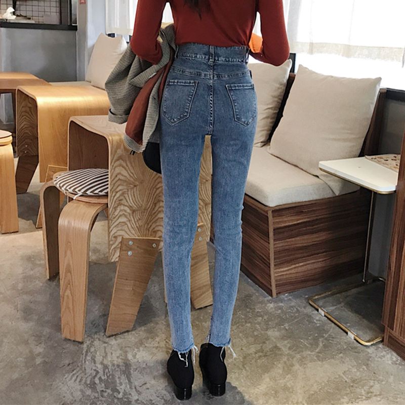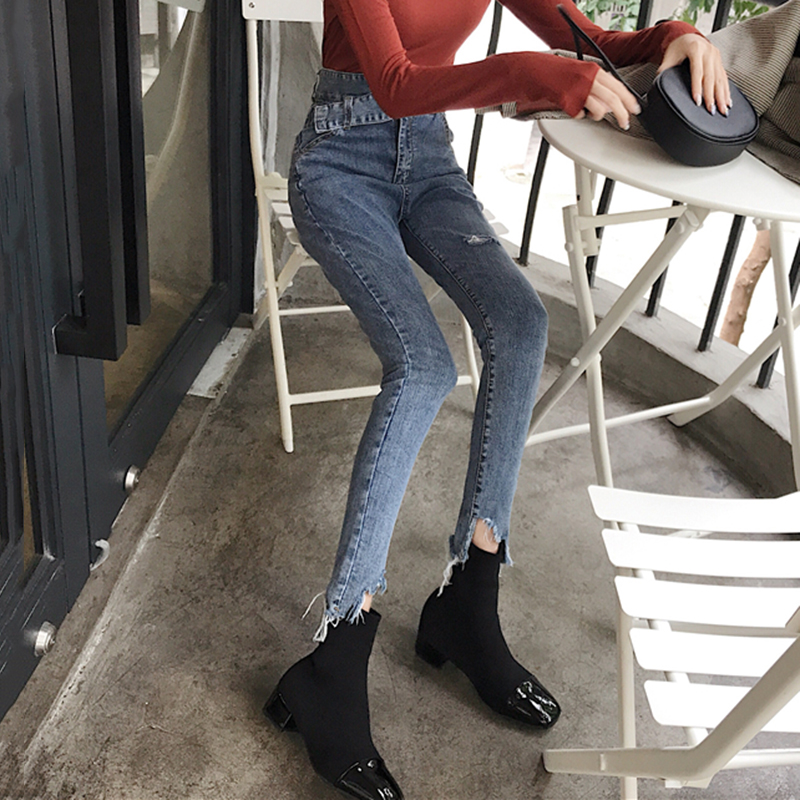 / 秋季女裝新款不規則高腰破洞毛邊牛仔褲修身彈力小腳鉛筆褲緊身褲