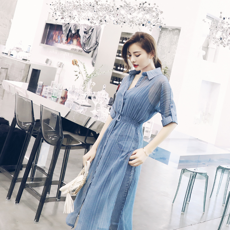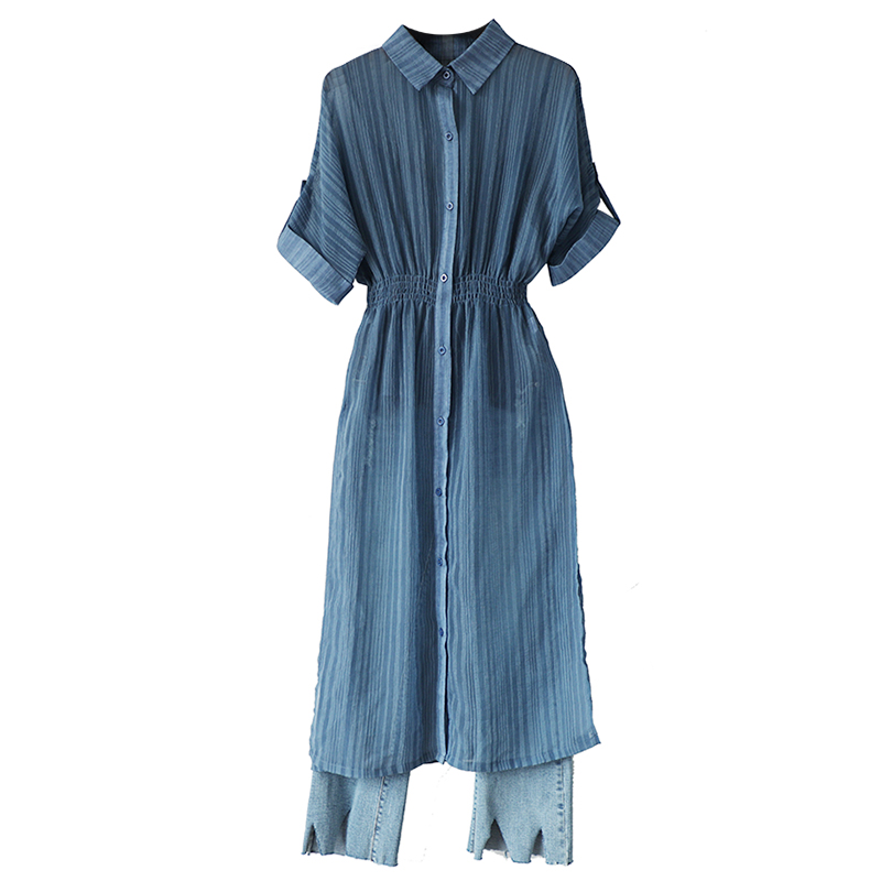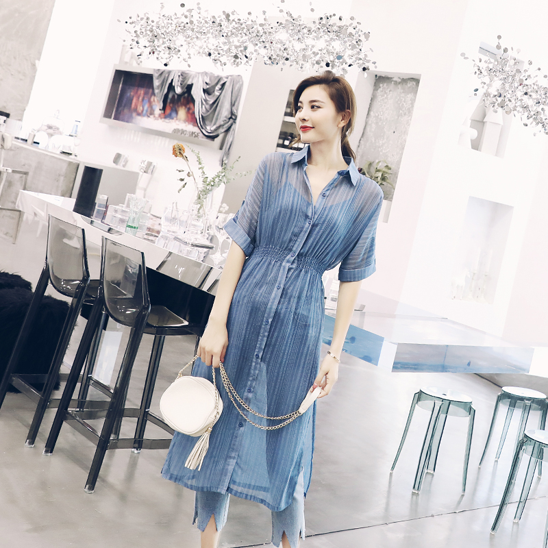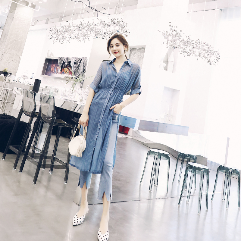 名媛慵懶風2018夏季新女裝中長款開叉襯衫吊帶背心牛仔褲三件套裝