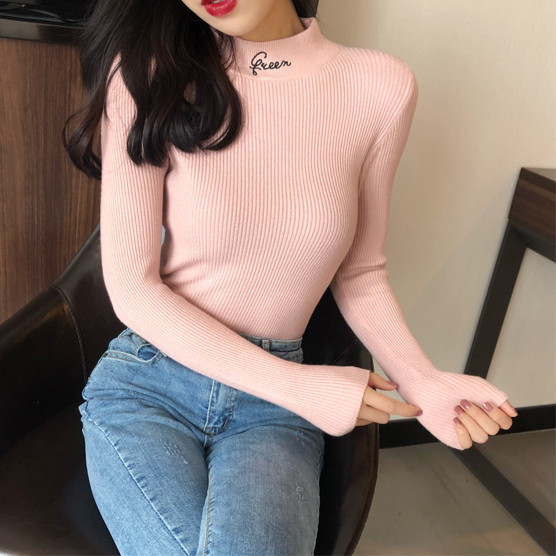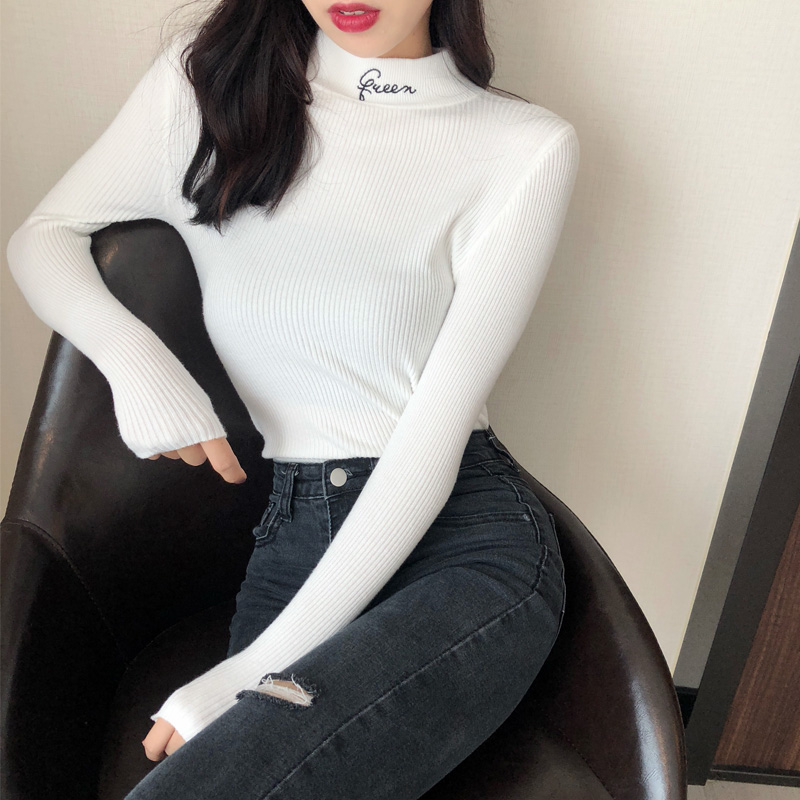 秋冬新款半高領刺繡字母套頭上衣chic修身顯瘦針織衫女長袖打底衫