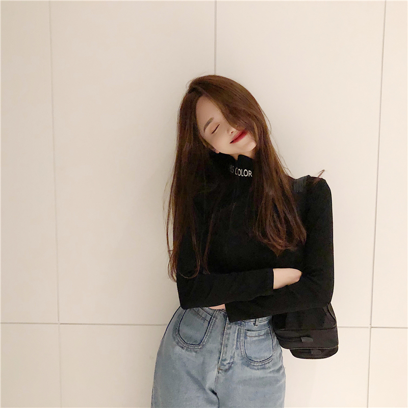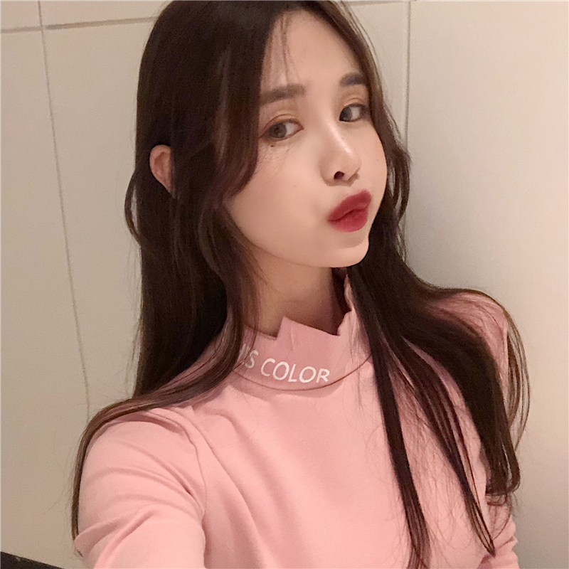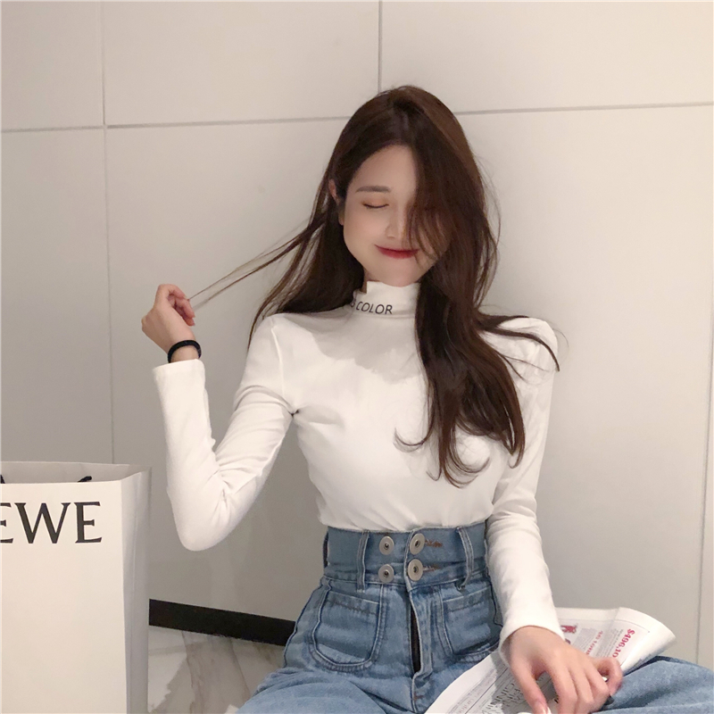 復古韓國chic風百搭半高領字母印花加絨加厚長袖T恤女新款打底衫