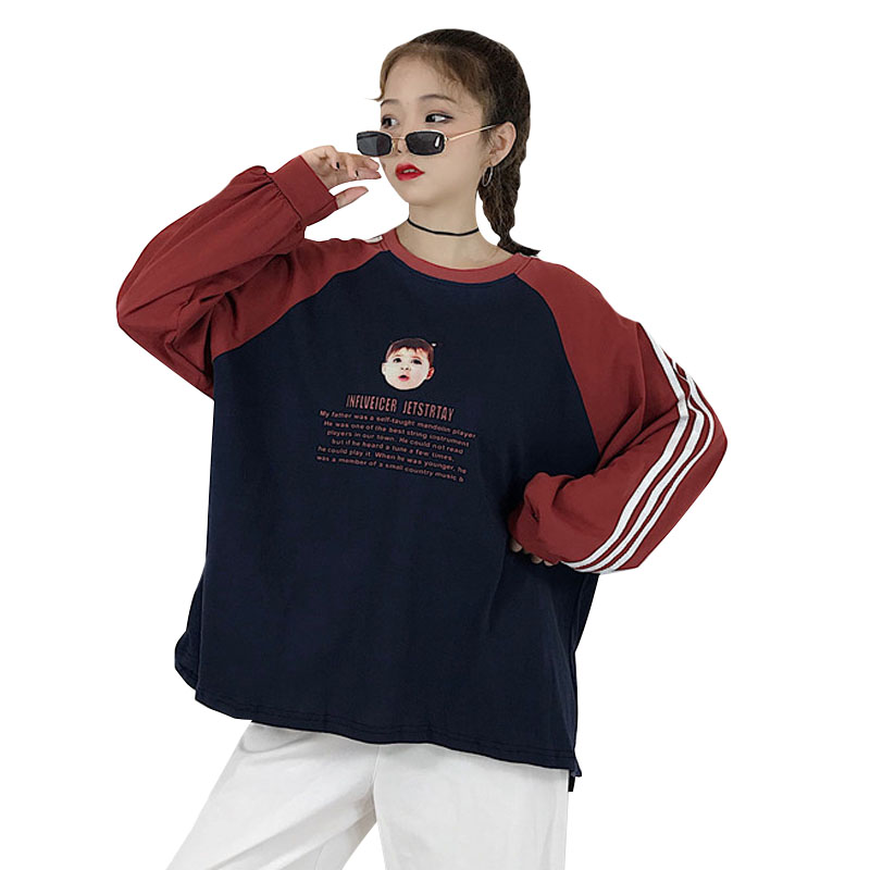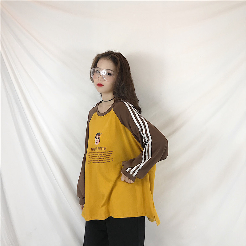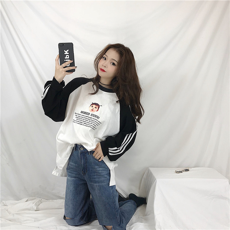 / 秋季女裝韓版學院風寬松字母卡通拼色條紋插肩袖長袖T恤顯瘦上衣