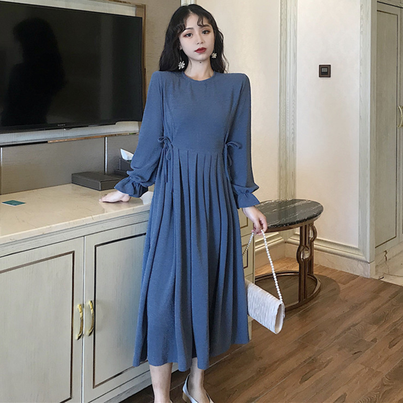 復古黑色中長連衣裙秋裝女新款收腰綁帶閃閃亮絲長袖a字大擺裙子