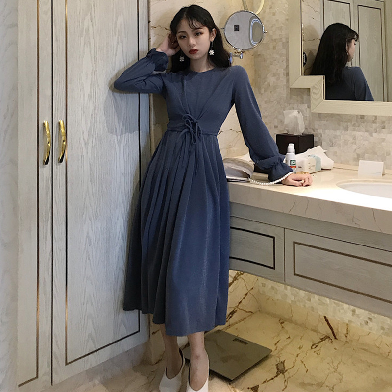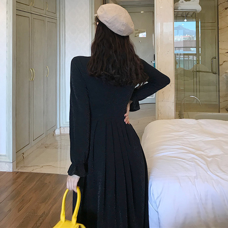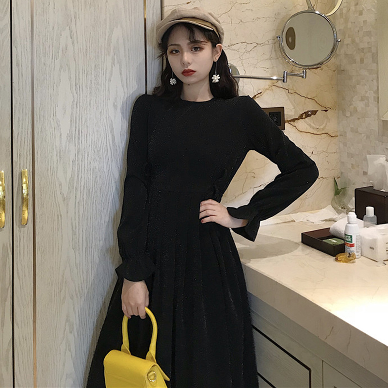 / 復古黑色中長連衣裙秋裝女新款收腰綁帶閃閃亮絲長袖a字大擺裙子