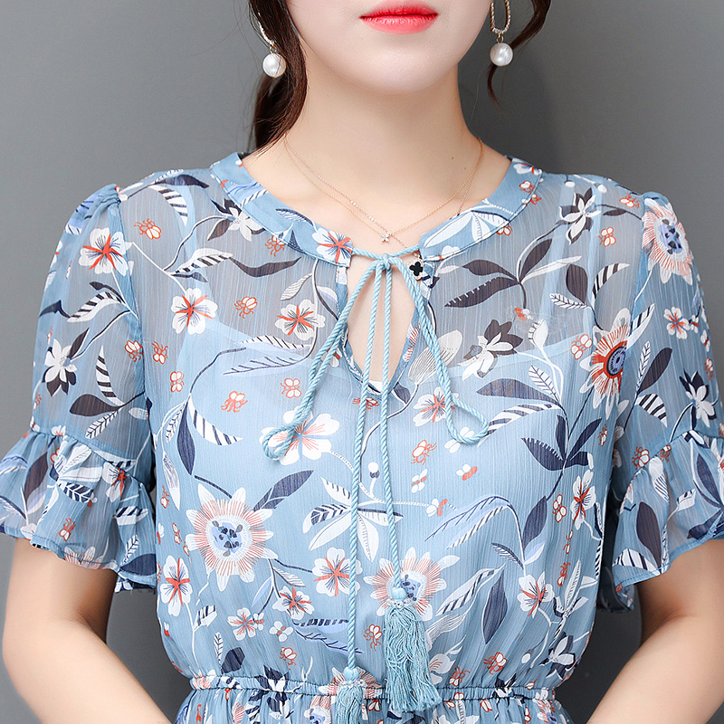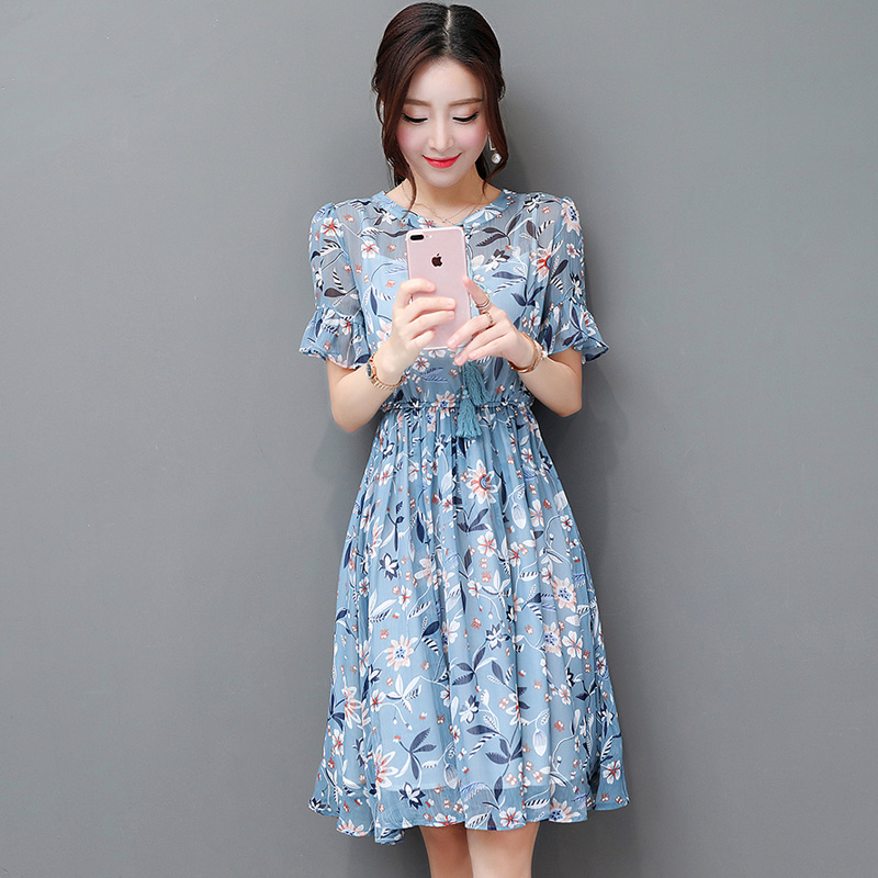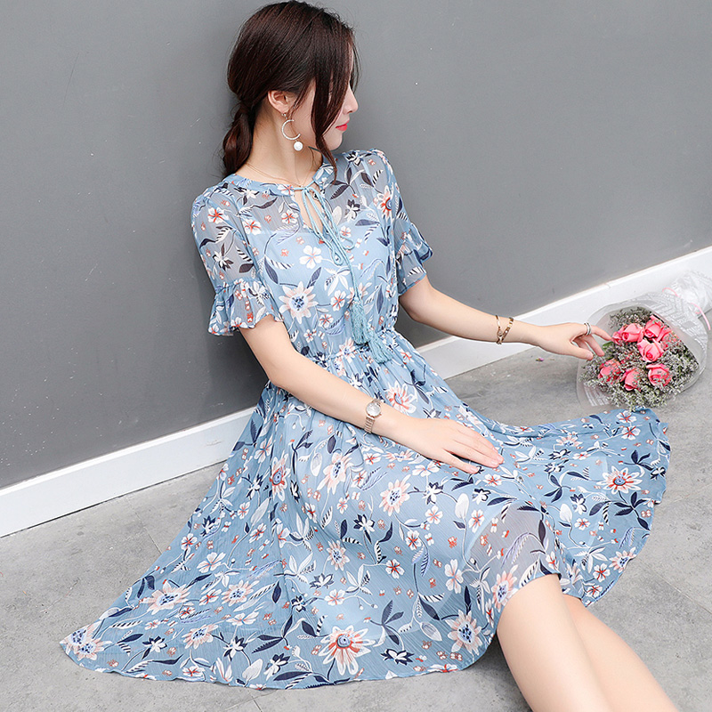 / 碎花雪紡連衣裙夏季新款時尚小清新收腰中長款度假沙灘裙女裝