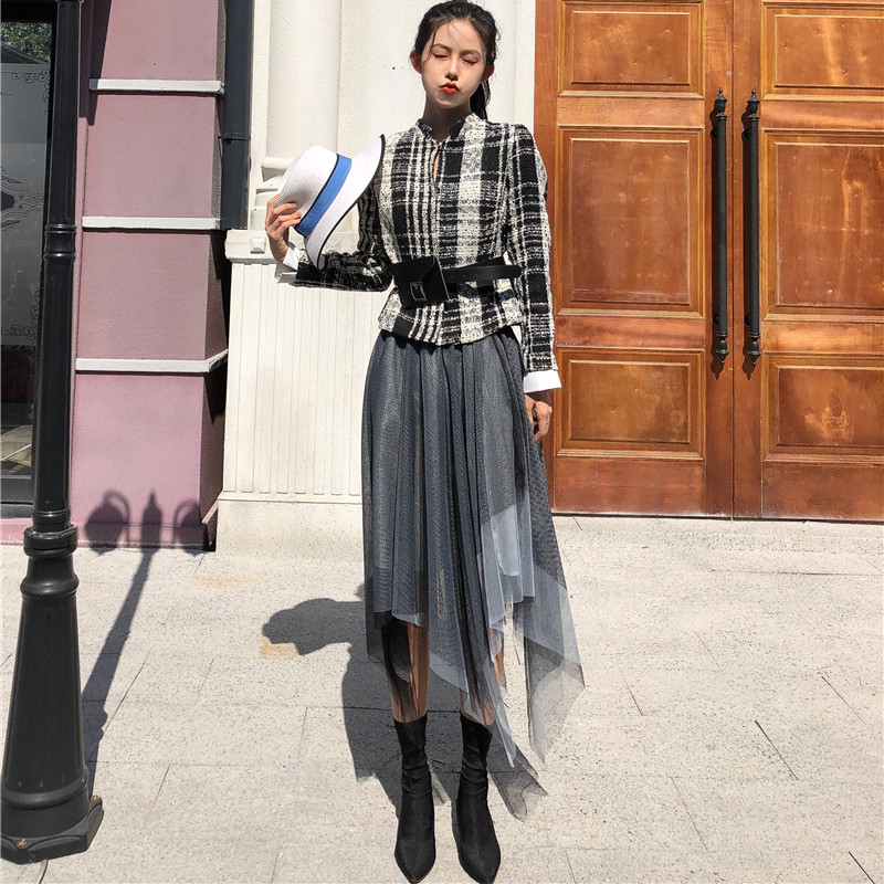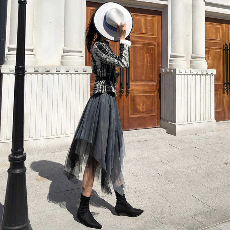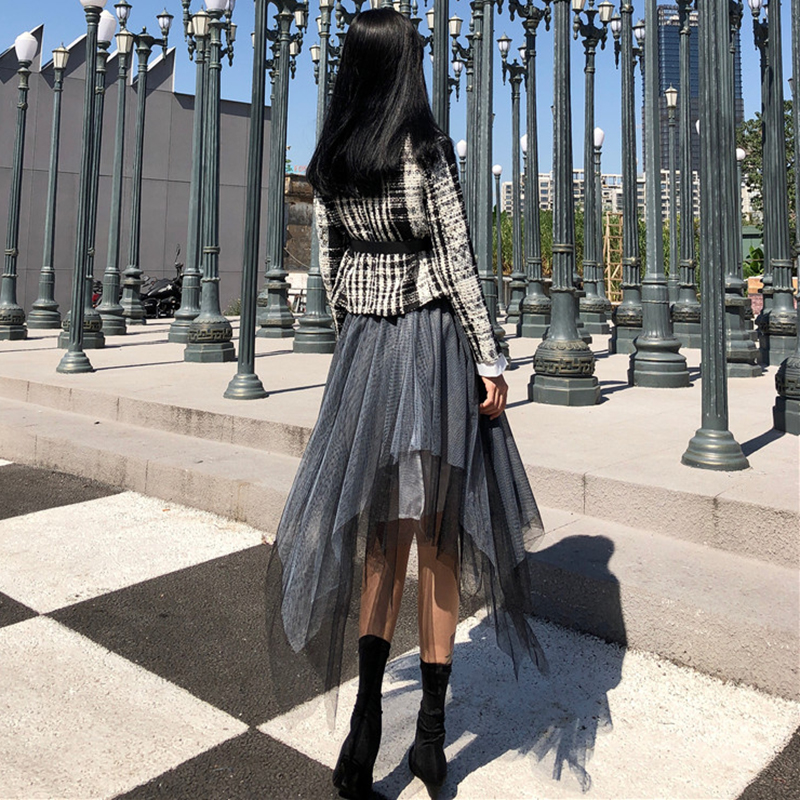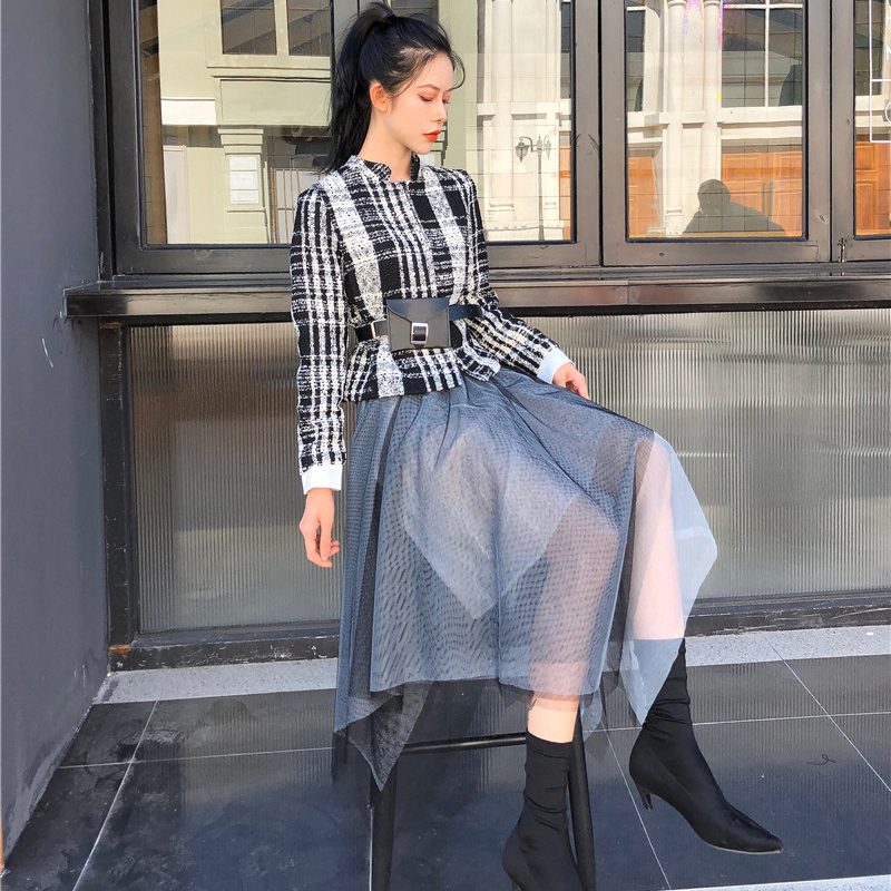 / 御姐套裝女秋冬新款黑白格子粗花呢外套高腰顯瘦不規則網紗半身裙