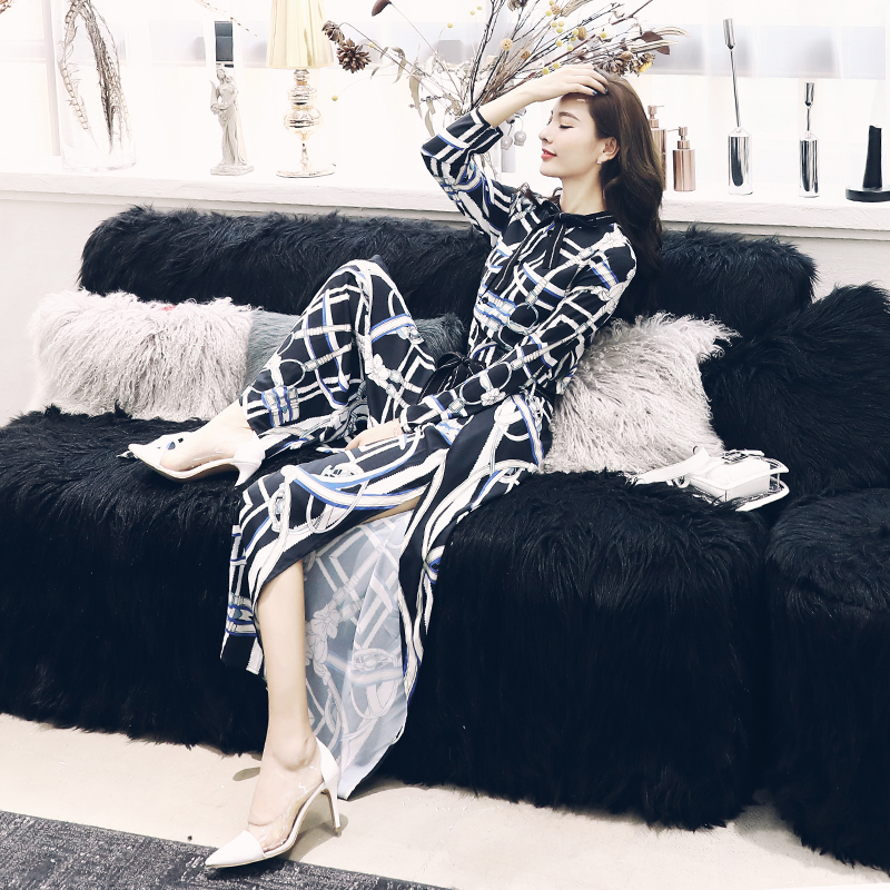 / 名媛2018秋季新款女裝韓版時髦氣質印花時尚套裝開叉闊腿褲兩件套