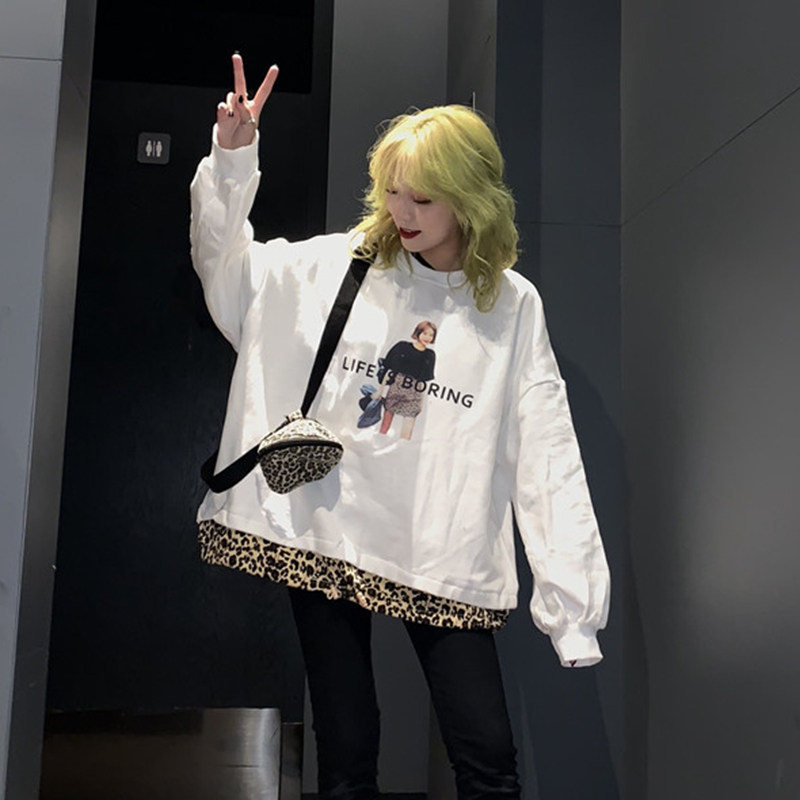 豹紋拼接圓領衛衣2018新款女秋冬裝港風抽繩時尚印花外套學生上衣