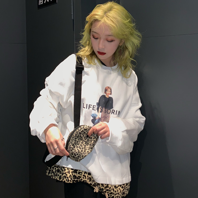 / 豹紋拼接圓領衛衣2018新款女秋冬裝港風抽繩時尚印花外套學生上衣