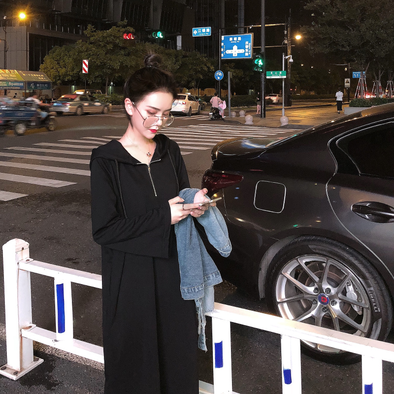 / chic早秋上衣慵懶長款過膝連帽衛衣女2018新款韓版寬松長袖衛衣裙