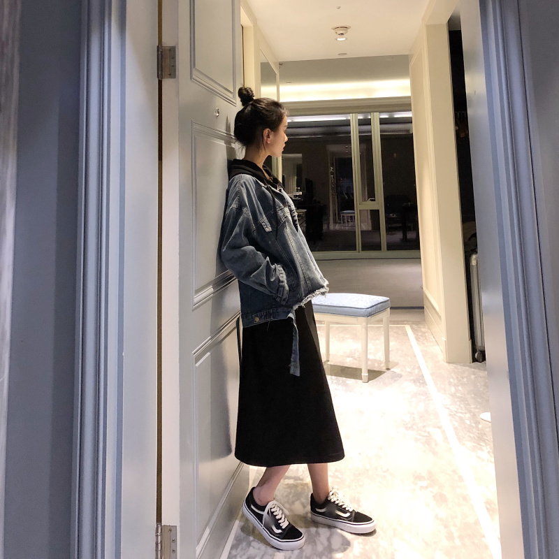 慵懶風秋裝女2018新款復古夾克牛仔外套女春秋+純色V領吊帶連衣裙
