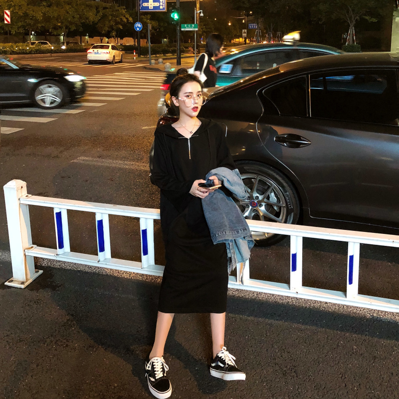 chic早秋上衣慵懶長款過膝連帽衛衣女2018新款韓版寬松長袖衛衣裙
