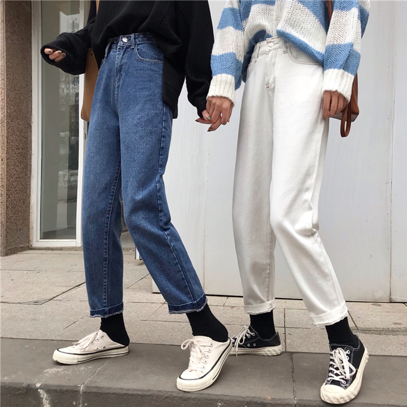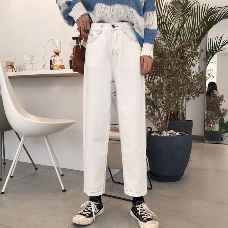 / 老爹褲女秋冬2018新款高腰顯瘦初戀牛仔褲學生寬松白色直筒長褲子