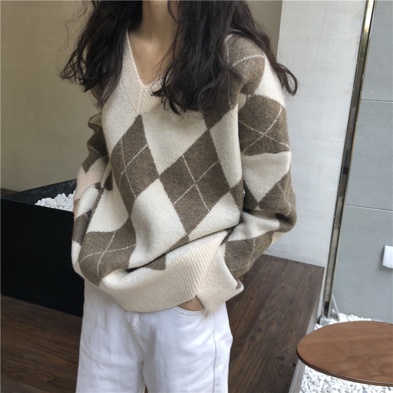 / 撞色菱格套頭針織外套女2018秋冬裝新款韓版寬松休閑長袖V領毛衣