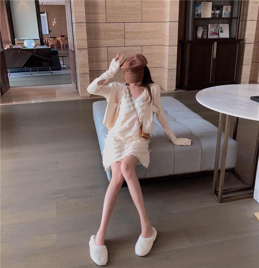 馬海毛網紅毛衣女2018新款針織開衫外套冷淡風針織吊帶連衣裙套裝