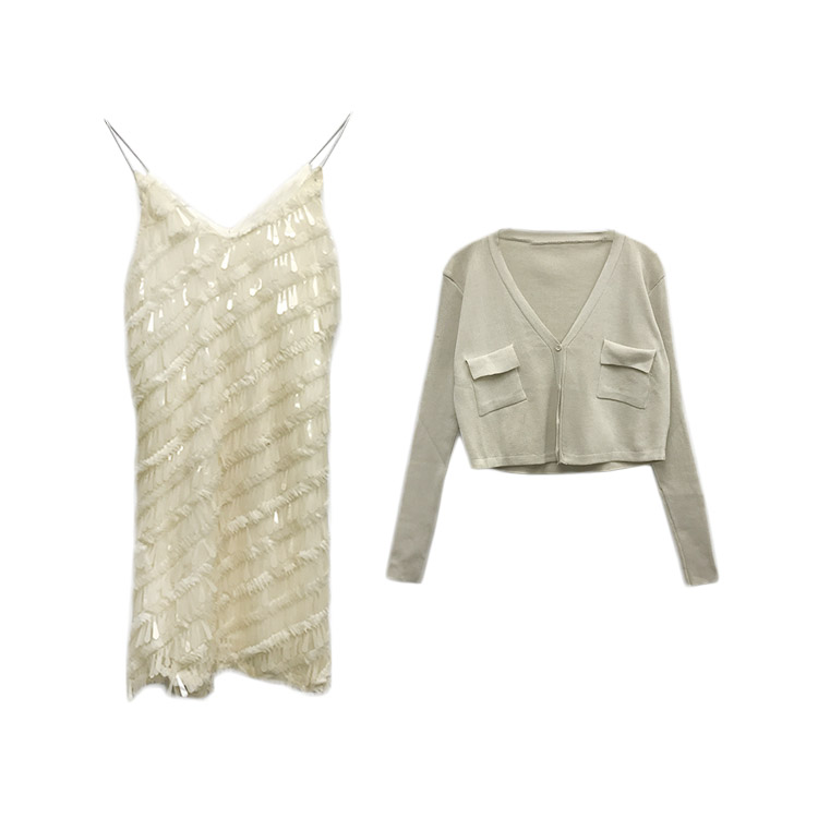 復古韓國chic風圓弧針織開衫+V領亮片吊帶性感連衣裙短裙時尚套裝