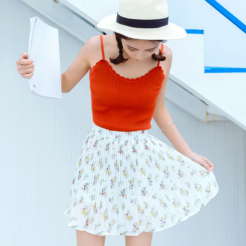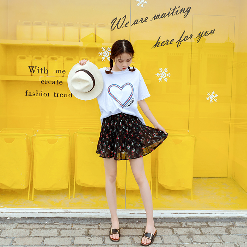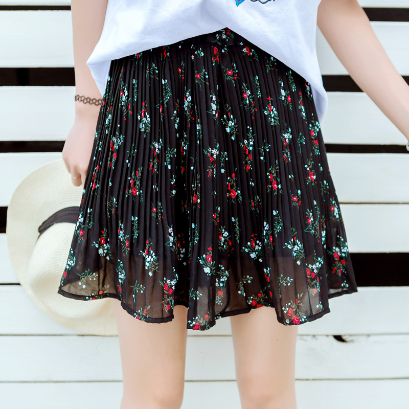 / 白色雪紡印花半身裙女夏裝新款女裝韓版高腰a字裙百褶裙子潮
