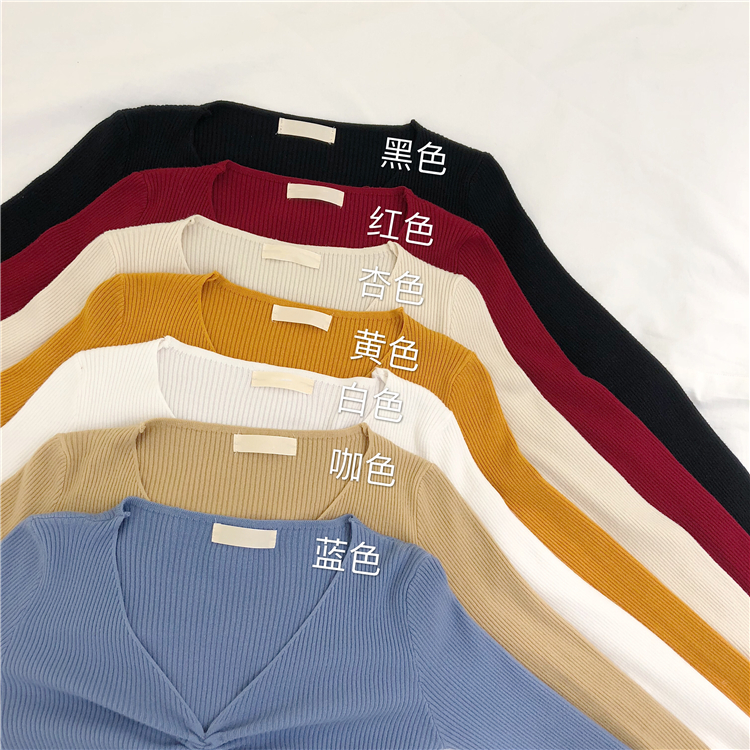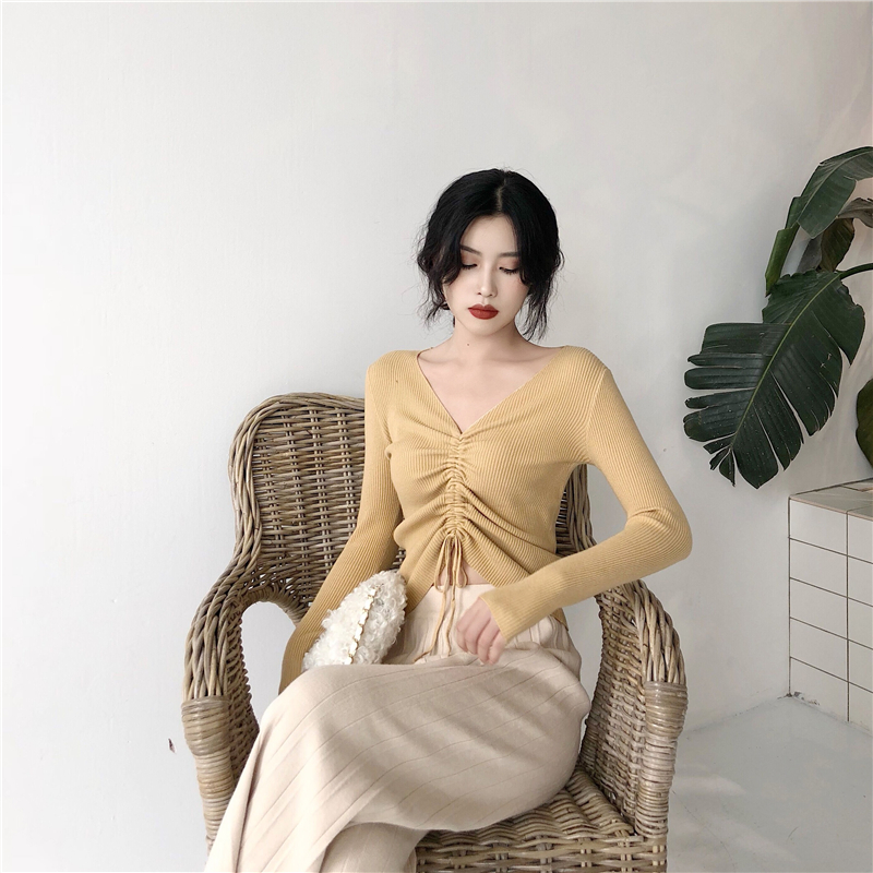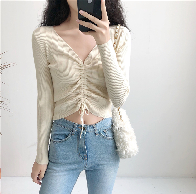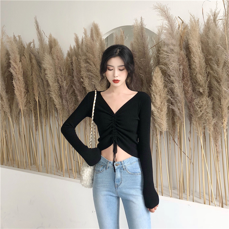 小心機上衣女秋季長袖復古chic風韓版新款V領抽繩短款修身針織衫