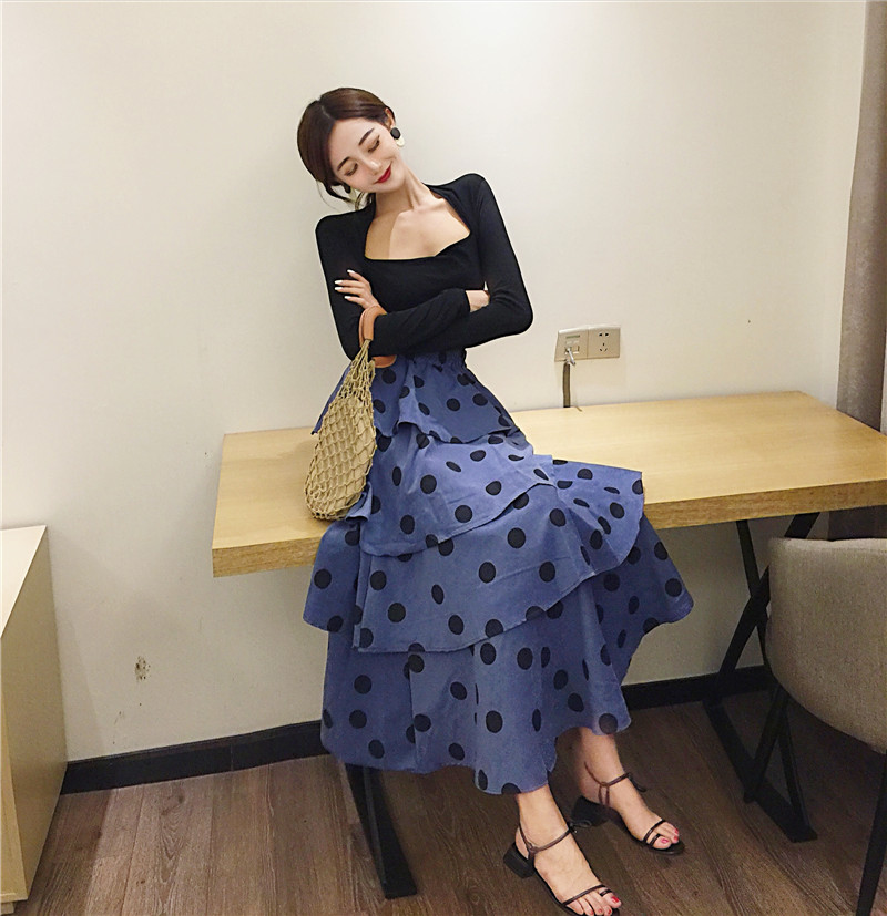 / 秋季復古基礎修身百搭上衣女+高腰松緊波點氣質大擺顯瘦蛋糕裙潮