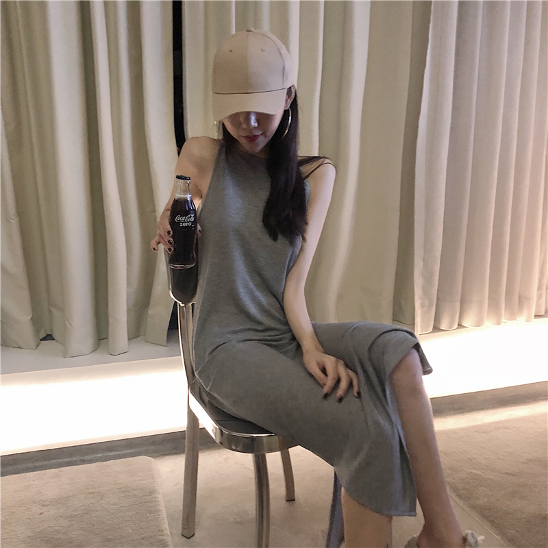 韓版時尚性感慵懶吊帶連衣裙女夏2018新款開叉修身顯瘦長裙一步裙
