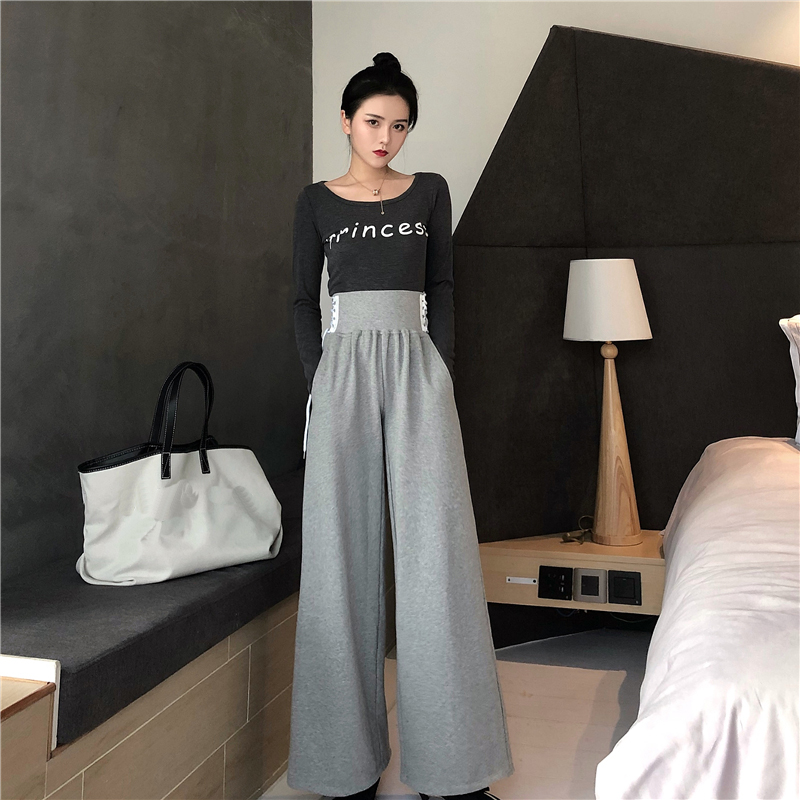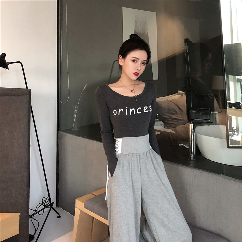 / 新款百搭圓領字母印花T恤高腰闊腿褲晚晚風休閑時尚港味氣質套裝