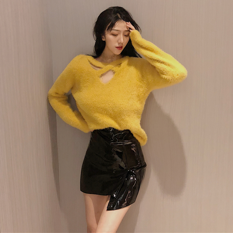 女神套裝女秋冬新款慵懶風掛脖鏤空上衣高腰顯瘦不規則PU小皮裙子