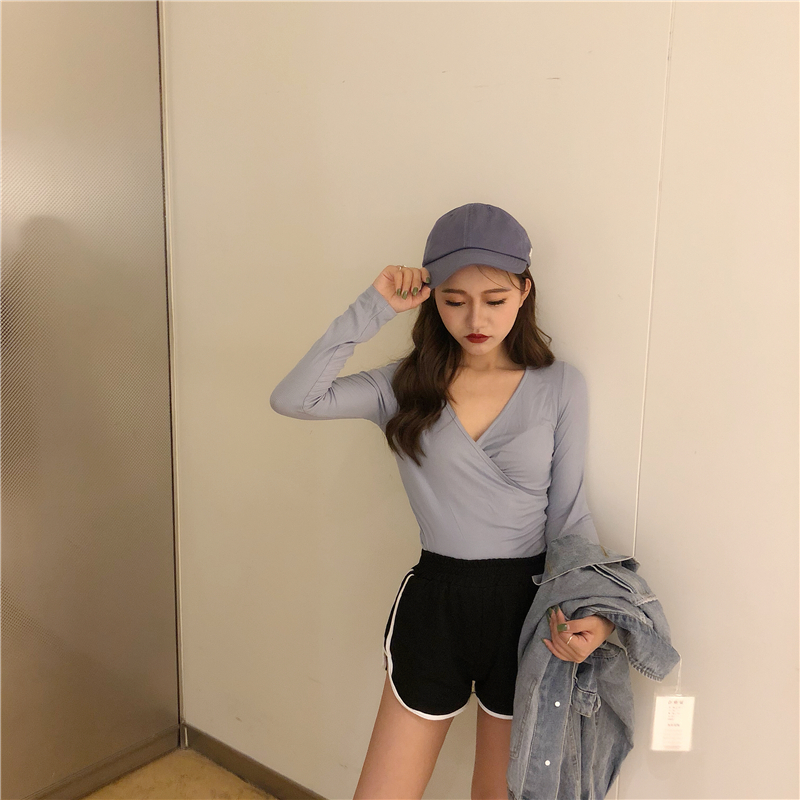 / 網紅同款氣質女神深V領坑條長袖打底上衣簡約時尚百搭T恤女早秋潮