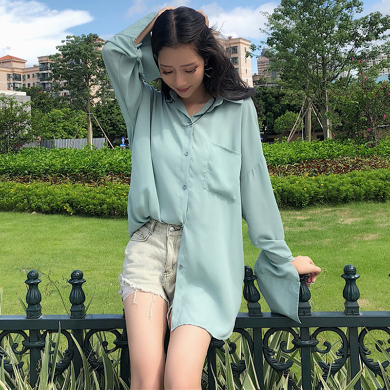 / 襯衫女夏新款韓版女裝長袖一排扣雪紡系帶收腰寬松顯瘦百搭上衣女