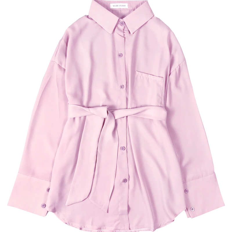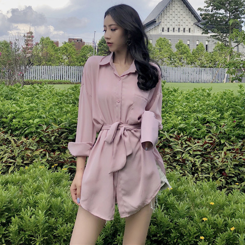 襯衫女夏新款韓版女裝長袖一排扣雪紡系帶收腰寬松顯瘦百搭上衣女