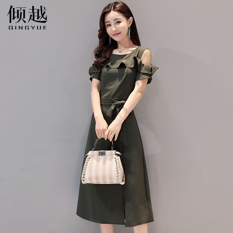 女裝2017夏新款名媛氣質韓版漏肩修身荷葉邊開叉連衣裙中長款裙子