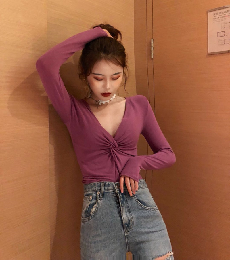 2018秋裝V領交叉長袖復古chicT恤修身上衣女新款純色扭結打底衫潮