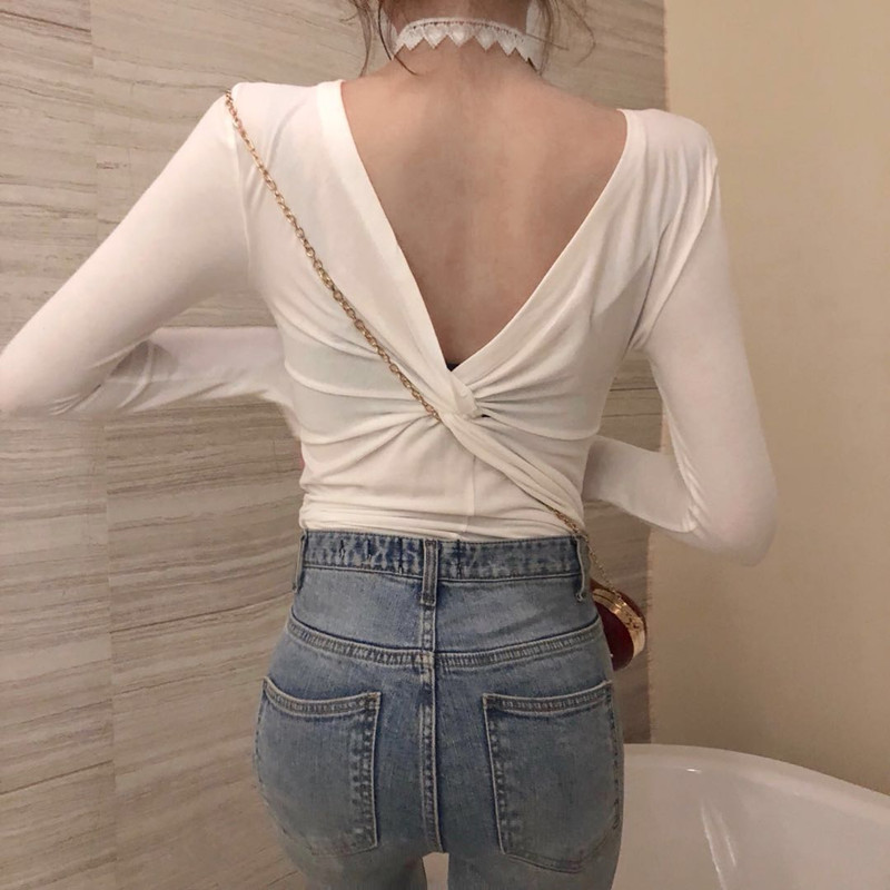 / 2018秋裝V領交叉長袖復古chicT恤修身上衣女新款純色扭結打底衫潮
