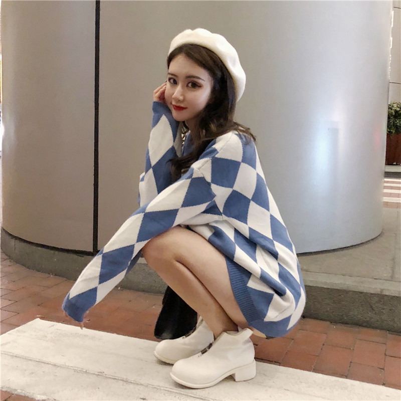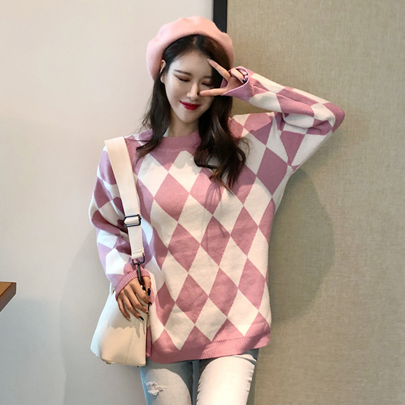 chic小清新百搭菱格毛衣外套女秋冬裝2018新款韓版寬松套頭針織衫