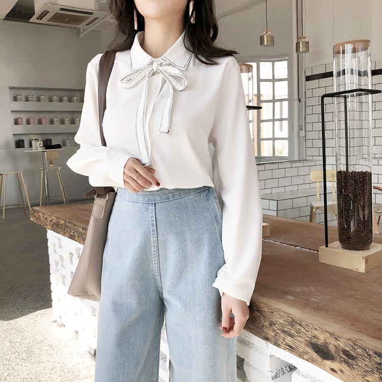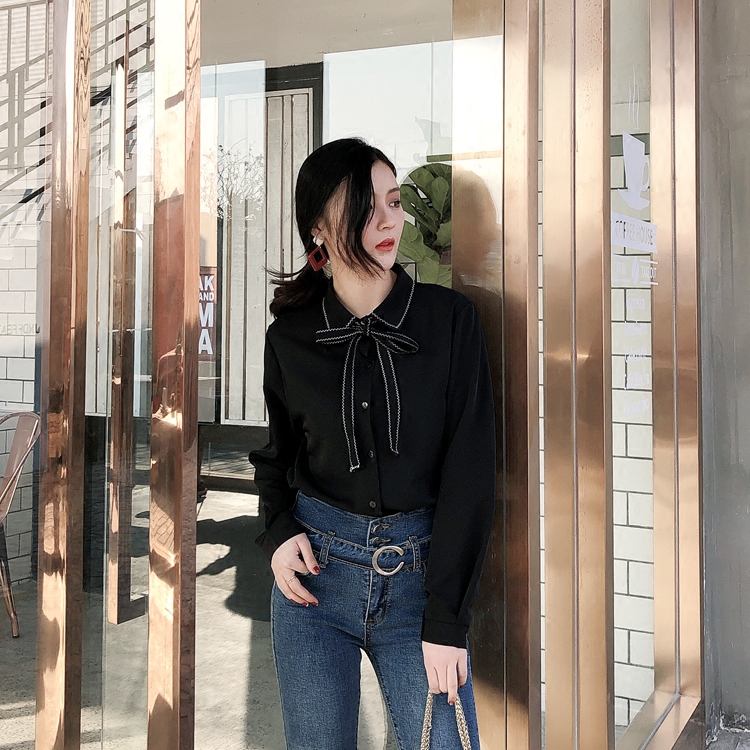 秋裝2018新款女裝韓國氣質寬松顯瘦系帶蝴蝶結襯衫女純色百搭襯衣