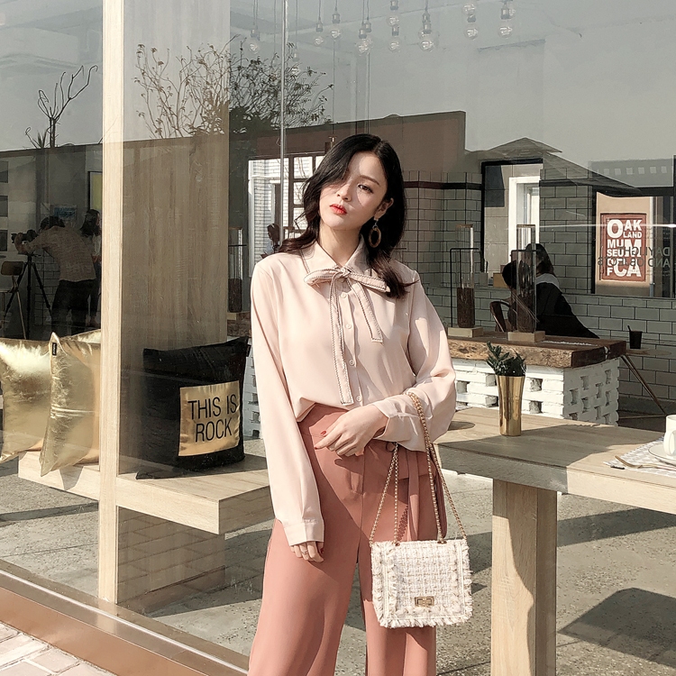 / 秋裝2018新款女裝韓國氣質寬松顯瘦系帶蝴蝶結襯衫女純色百搭襯衣