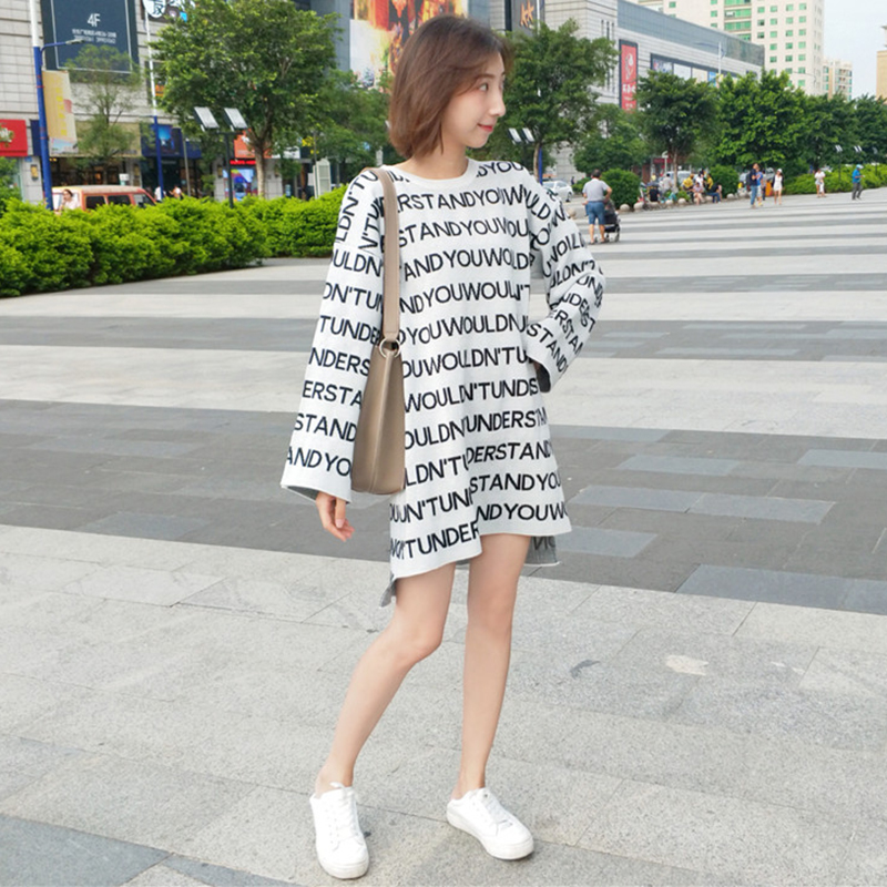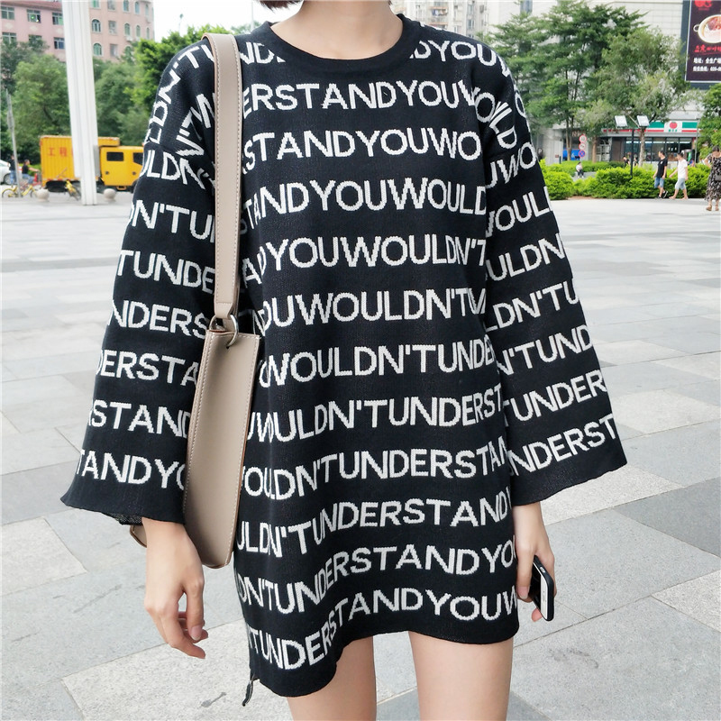 慵懶寬松長袖針織衫秋裝女2018新款韓版學生前短后長字母休閑上衣