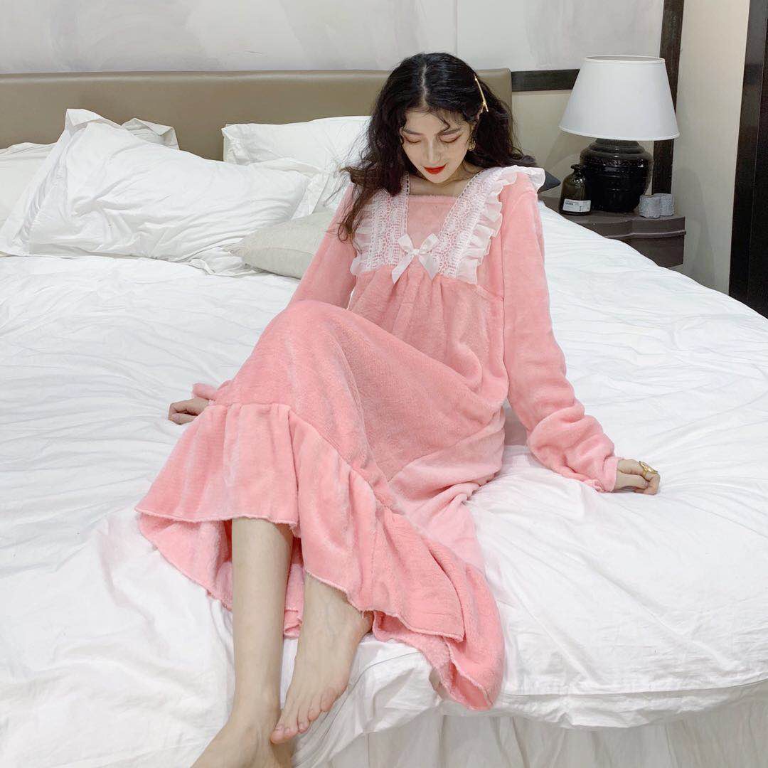 秋裝韓版時尚毛絨絨加厚荷葉邊長袖睡衣連衣裙睡裙家居服女士長裙