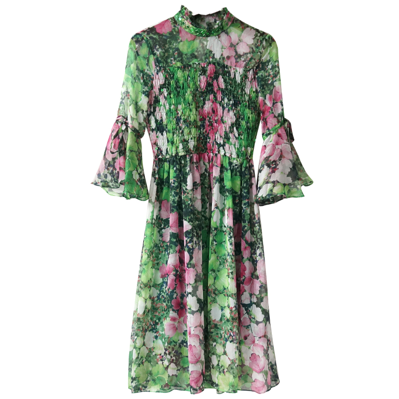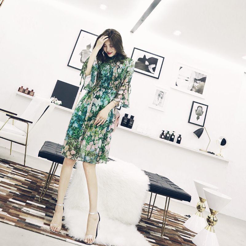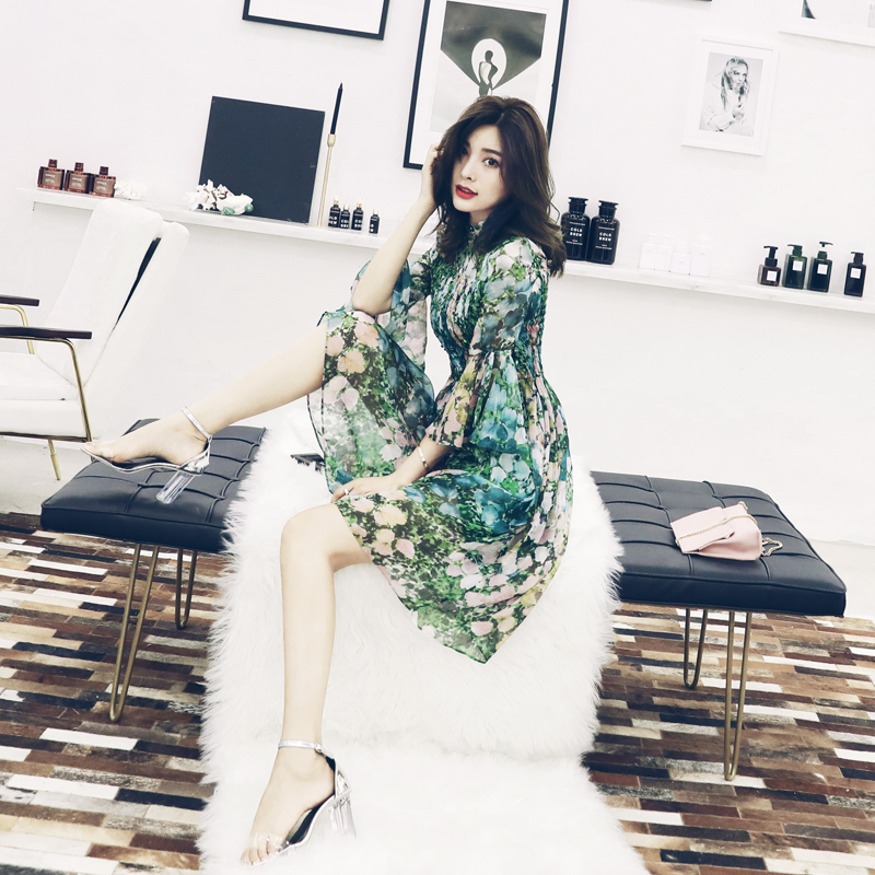 S秀淑女氣質2018夏季新款喇叭袖上衣超仙顯瘦印花裙子連衣裙潮