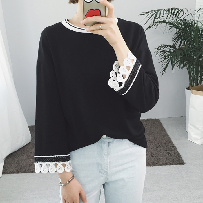 / 秋裝新款韓版百搭休閑寬松撞色領口拼接花邊袖上衣T恤女裝