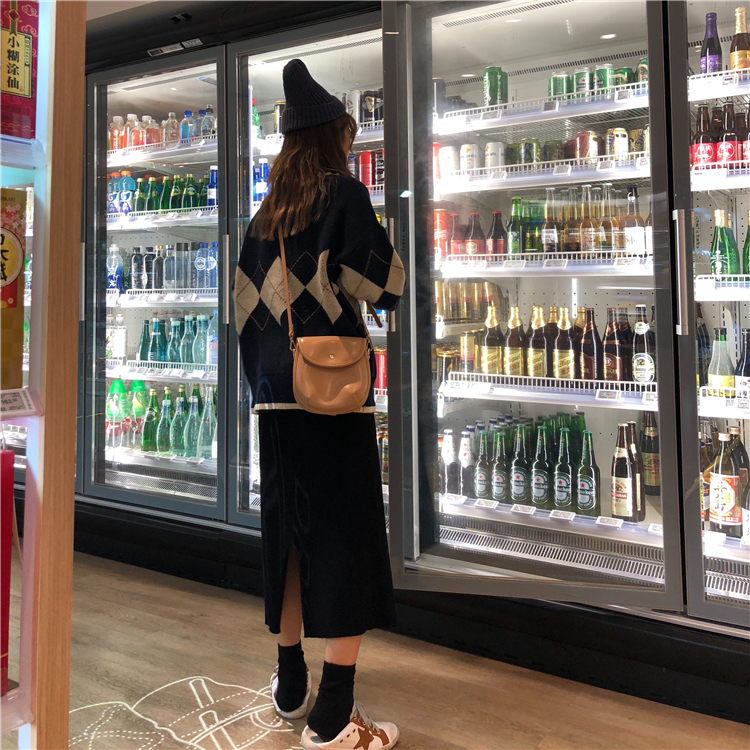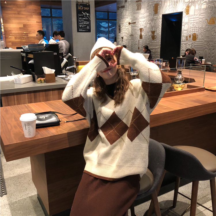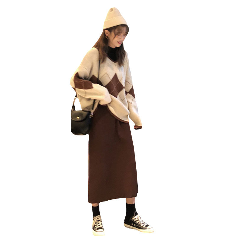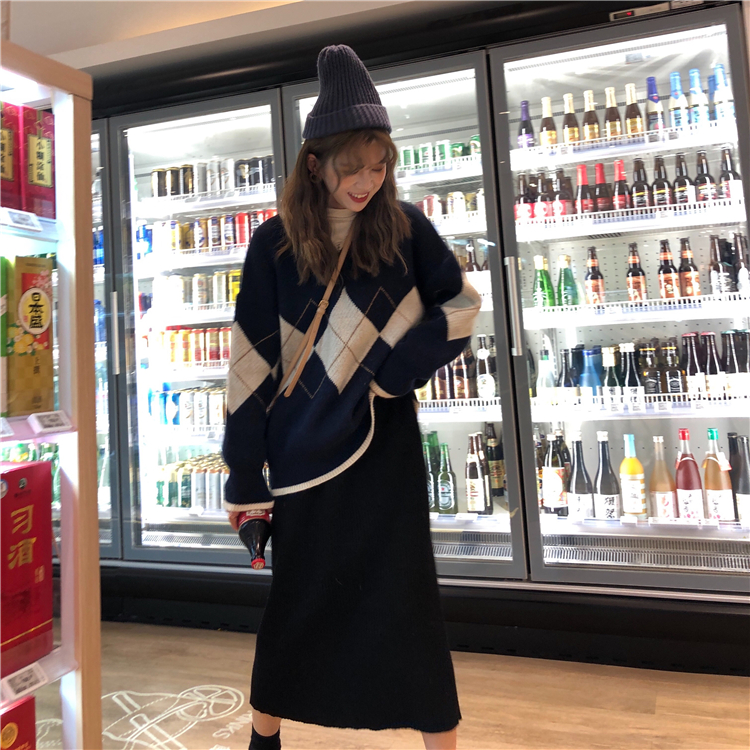 / 韓版時尚休閑套裝秋季女裝V領加厚菱格針織毛衣+開叉半身裙兩件套
