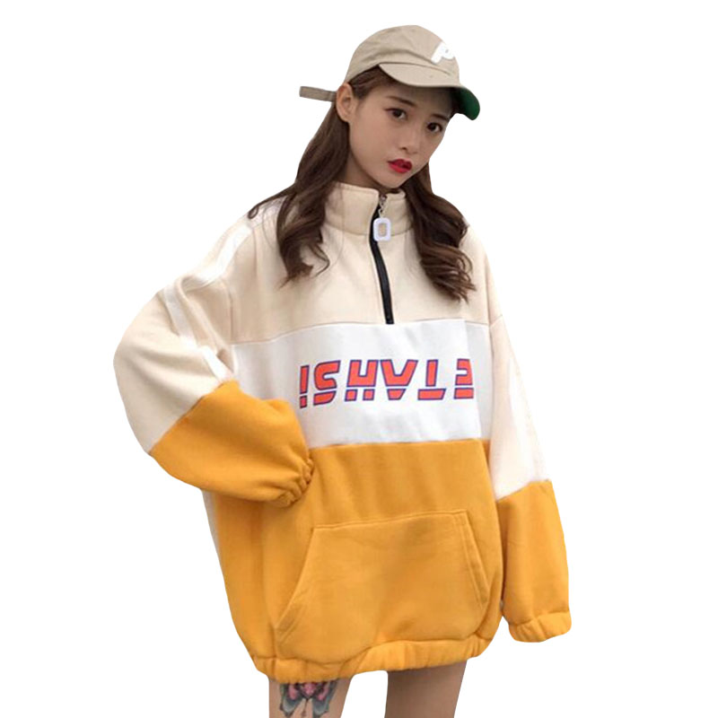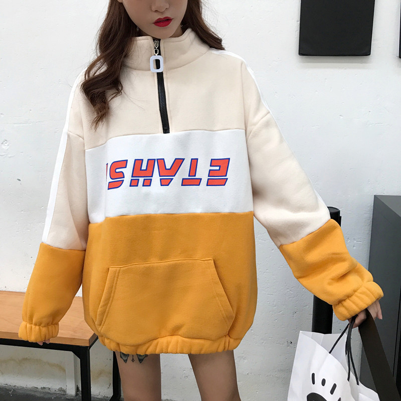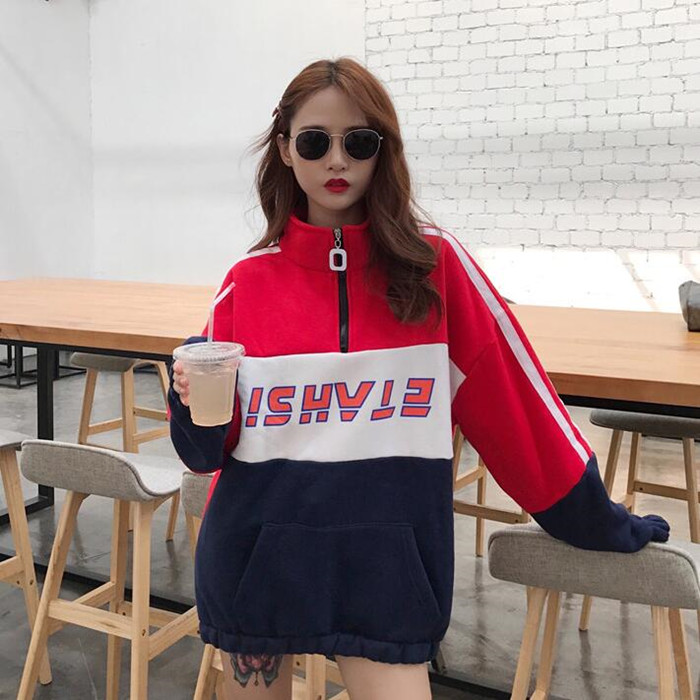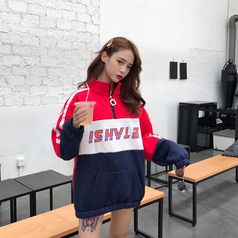 / 秋冬女裝韓版中長款原宿風拼色字母加絨加厚寬松超火衛衣上衣外套