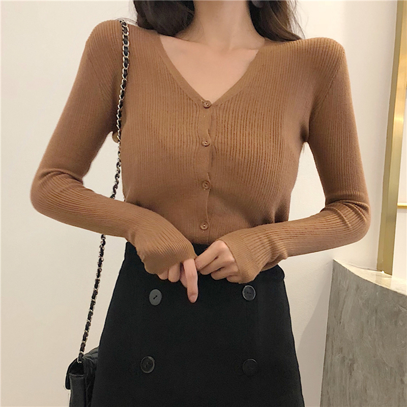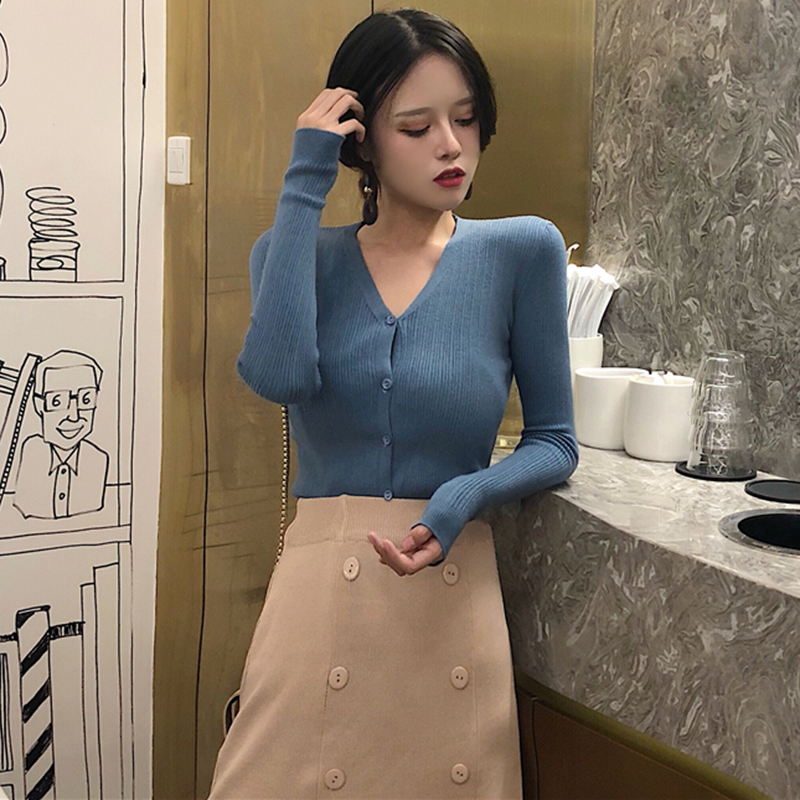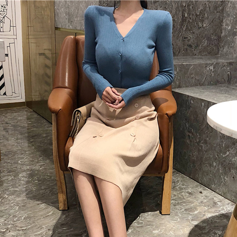 / 港味套裝女秋2018新款修身長袖針織開衫短外套高腰中長半身黑裙子