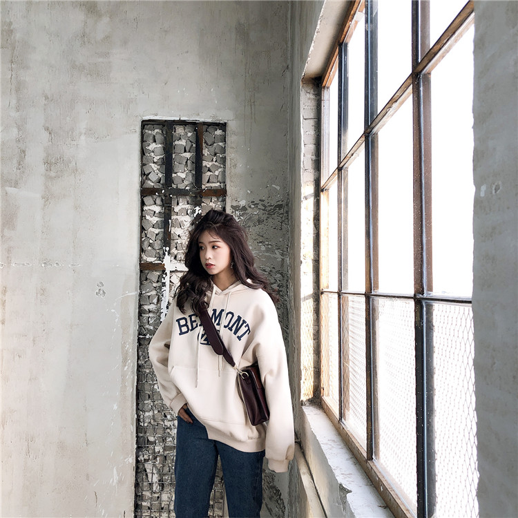 早上好英文寬松連帽加絨衛衣女2018新款chic早秋學生韓版套頭上衣
