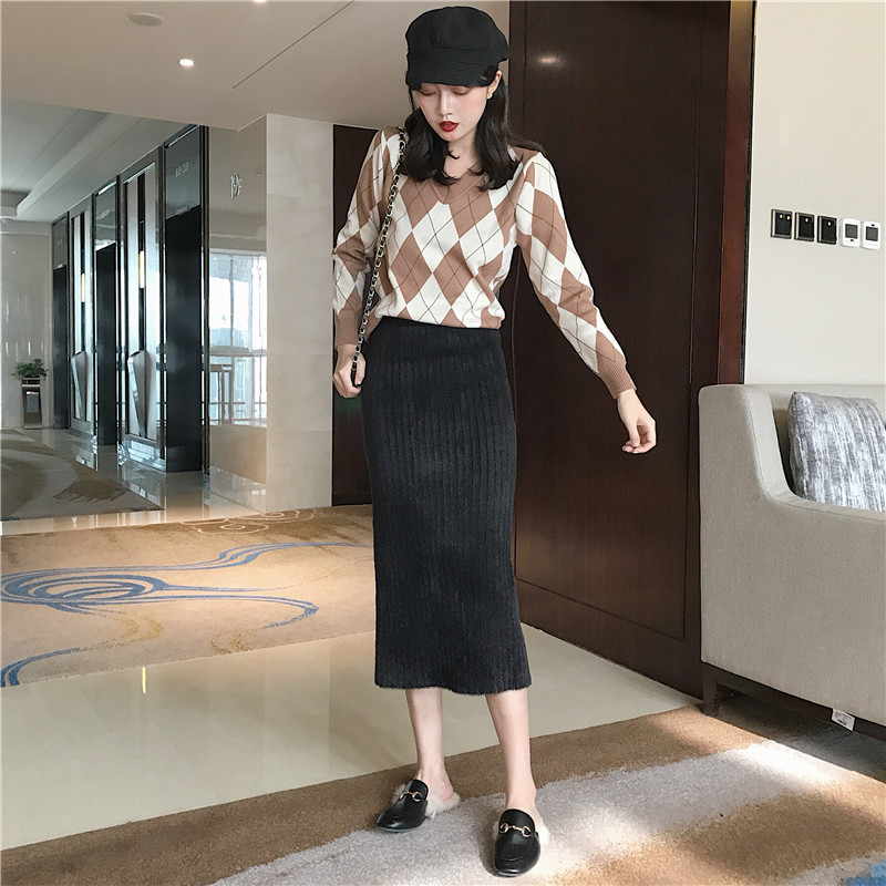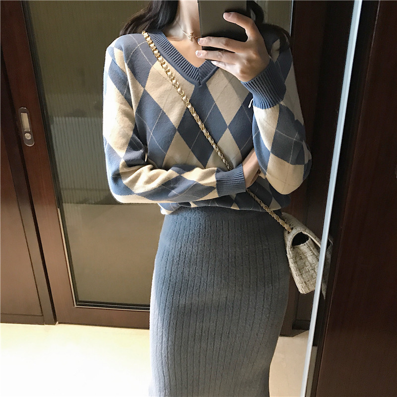 / 韓版秋裝女2018新款套裝菱形格子V領毛衣+高腰顯瘦針織開叉半身裙