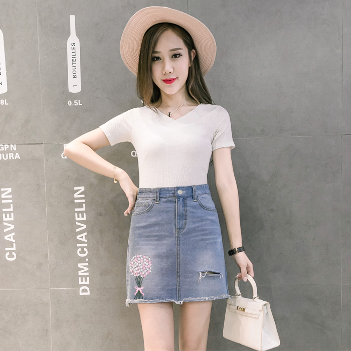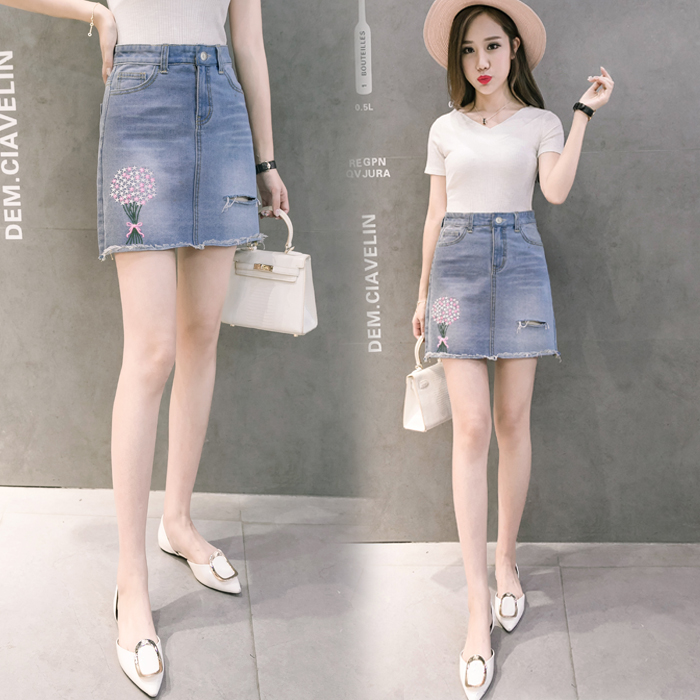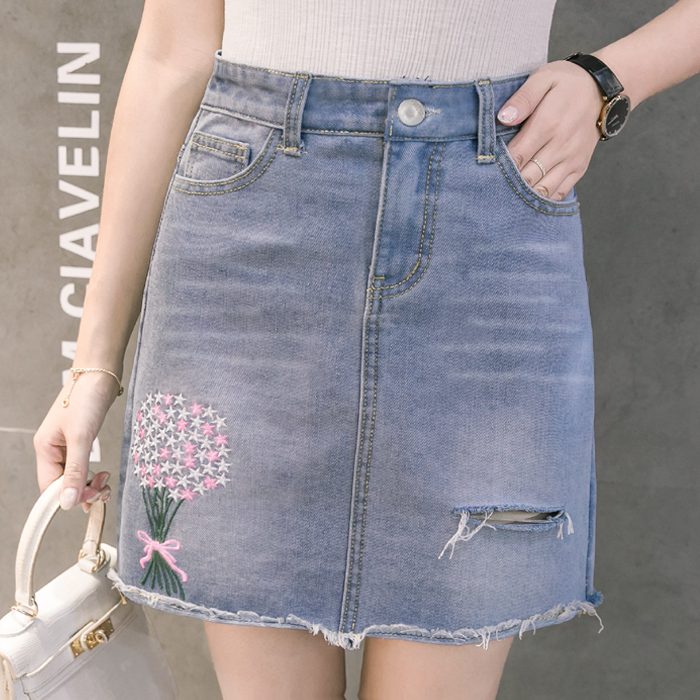 / 韓版高腰繡花牛仔裙半身裙女破洞短裙A字裙包臀毛邊半裙夏季