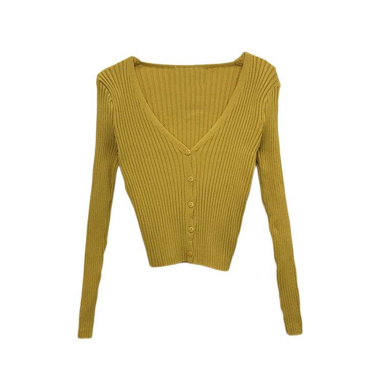 韓版chic早秋慵懶溫柔毛衣坑條V領一排扣喇叭袖純色百搭針織開衫