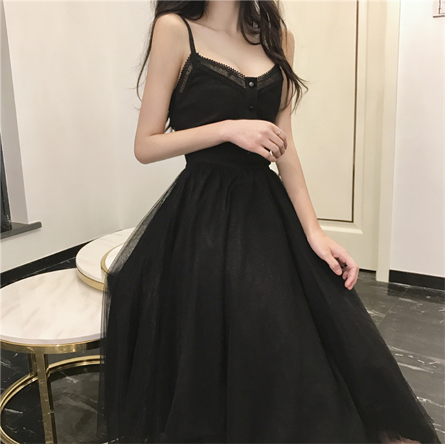 / 秋裝2018新款女蕾絲吊帶拼接連衣裙百搭純色寬松V領顯瘦中長裙潮