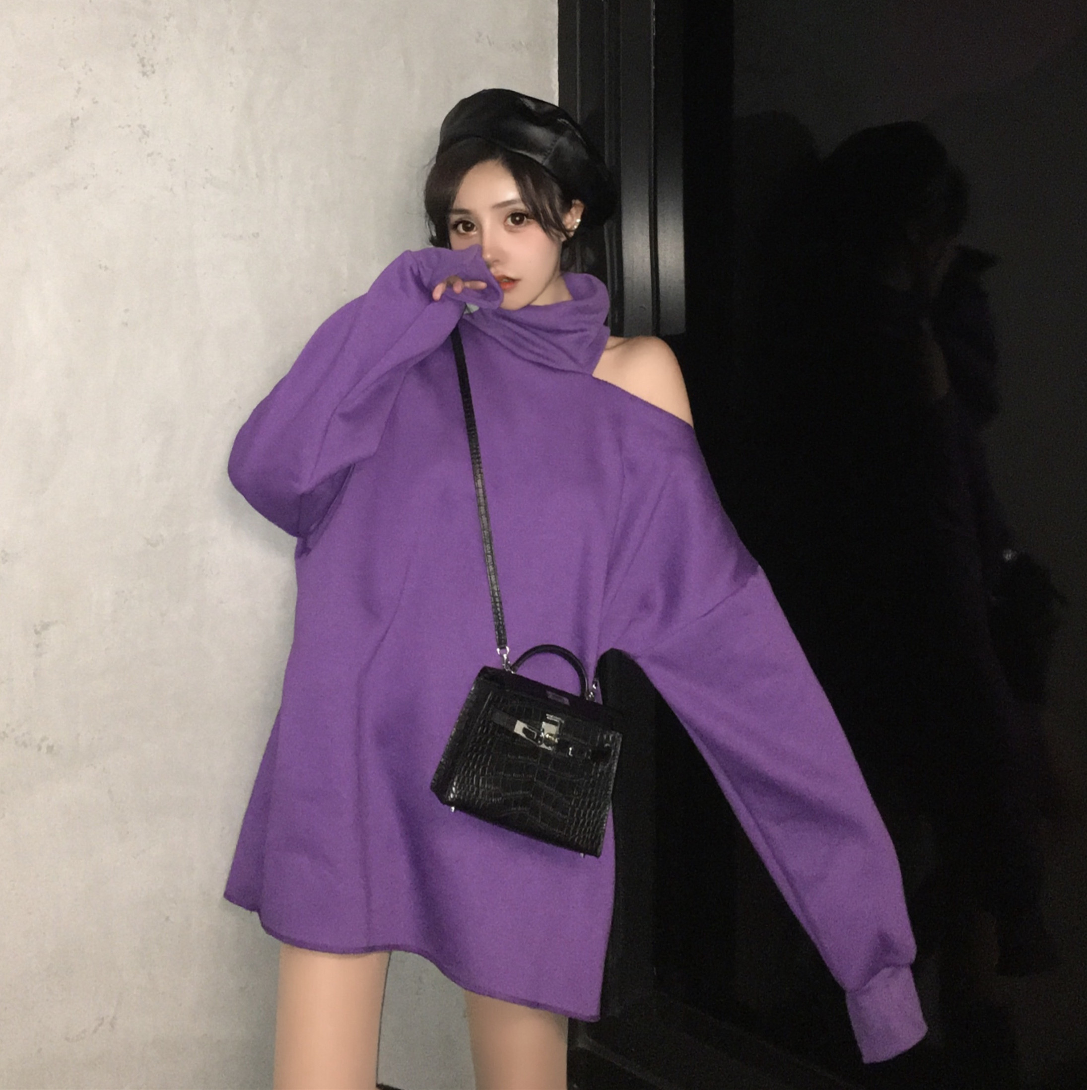 / chic早秋上衣慵懶中長款純色衛衣女秋2018新款高領加絨露肩掛脖女